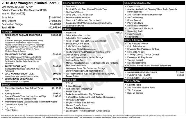 New Price! Firecracker Red Clearcoat Unlimited Sport S 4WD 6-Speed Manual 3.6L V6 24V VVT Back Up Camera, Bluetooth®, 6-Speed Manual Transmission, Alloy Wheels, Audio Controls on the Steering Wheel, Blind Zone Monitoring, Clean Cloth Interior, Cruise Control, Dual Climate Control, Premium Heated Cloth Seats, Proximity Keyless Entry, Push Button Start, Rear Parking Sensors, Rear View Camera, Satellite Radio, Side Air Bags, 1-Yr SiriusXM Radio Service, 7.0 Touchscreen Display, ABS brakes, Air Conditioning w/Auto Temperature Control, Air Filtering, AM/FM radio, Apple CarPlay, Automatic Headlamps, Blind Spot & Cross Path Detection, Brake assist, Cluster 7.0 TFT Color Display, Cold Weather Group, Convenience Group, Deep Tint Sunscreen Windows, Delay-off headlights, Driver door bin, Dual front impact airbags, Electronic Stability Control, Engine Block Heater, For More Info, Call 800-643-2112, Front 1-Touch Down Power Windows, Front Bucket Seats, Front fog lights, Google Android Auto, GPS Antenna Input, Heated Front Seats, Heated Steering Wheel, Injection Molded Black Rear Bumper, Integrated Center Stack Radio, Integrated roll-over protection, Leather Wrapped Steering Wheel, LED Taillamps, Occupant sensing airbag, ParkSense Rear Park Assist System, ParkView Rear Back-Up Camera, Passenger vanity mirror, Power Heated Mirrors, Quick Order Package 23S Sport S, Radio: Uconnect 3 w/5 Display, Radio: Uconnect 4 w/7 Display, Remote Keyless Entry, Safety Group, Security Alarm, SiriusXM Satellite Radio, Speed Sensitive Power Locks, Sun Visors w/Illuminated Vanity Mirrors, Tachometer, Technology Group, Tilt steering wheel, Universal Garage Door Opener, USB Host Flip, Wheels: 17 x 7.5 Black Steel Styled, Wheels: 17 x 7.5 Tech Silver Aluminum.