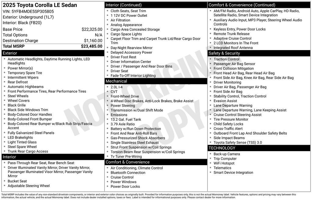 Underground LE FWD CVT 2.0L I4 DOHC 16V Back Up Camera, Bluetooth®, Clean History Report, Audio Controls on the Steering Wheel, Clean Cloth Interior, Cruise Control, Proximity Keyless Entry, Rear View Camera, Satellite Radio, Side Air Bags, a Clean, One Owner Carfax, 4-Wheel Disc Brakes, 6 Speakers, Air Conditioning, Apple CarPlay/Android Auto, Auto High-beam Headlights, Brake assist, Delay-off headlights, Driver door bin, Dual front impact airbags, Dual front side impact airbags, Electronic Stability Control, Emergency communication system: Safety Connect (up to 10-year trial subscription), Exterior Parking Camera Rear, Fabric Seat Trim, Front anti-roll bar, Front Center Armrest, Fully automatic headlights, Knee airbag, Occupant sensing airbag, Power steering, Radio data system, Radio: 8 Toyota Audio Multimedia, Rear anti-roll bar, Rear window defroster, Remote keyless entry, Speed control, Split folding rear seat, Steering wheel mounted audio controls, Tachometer, Tilt steering wheel, Trip computer.